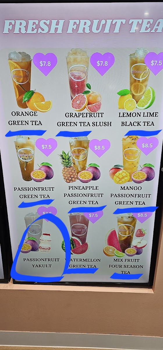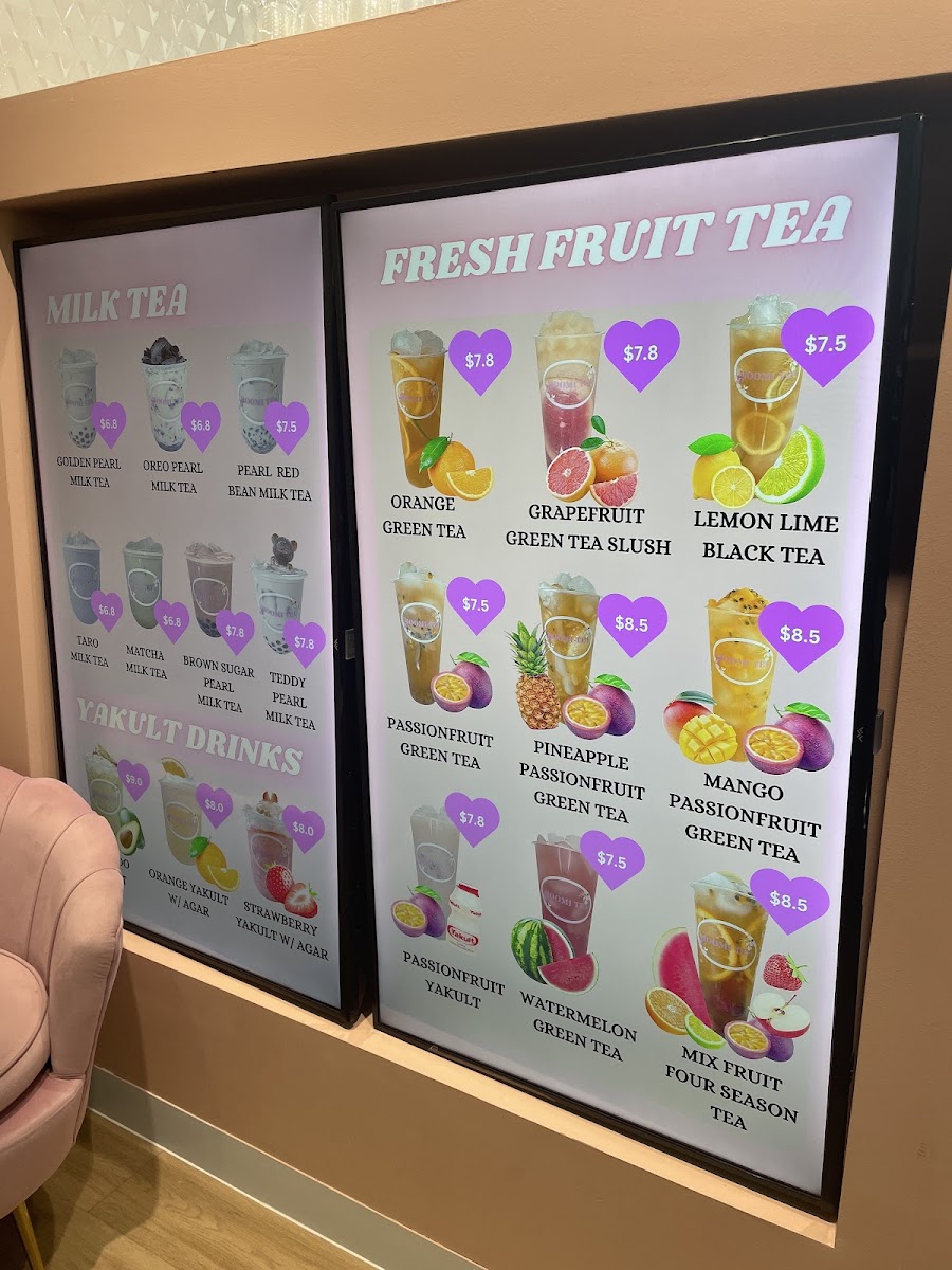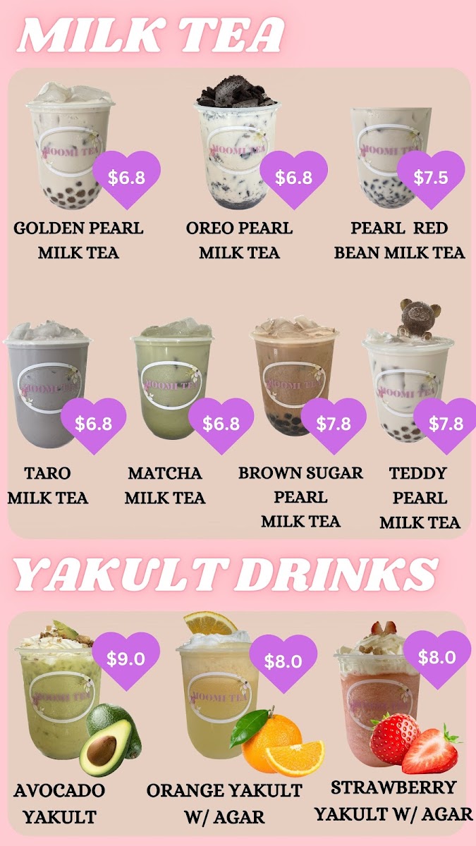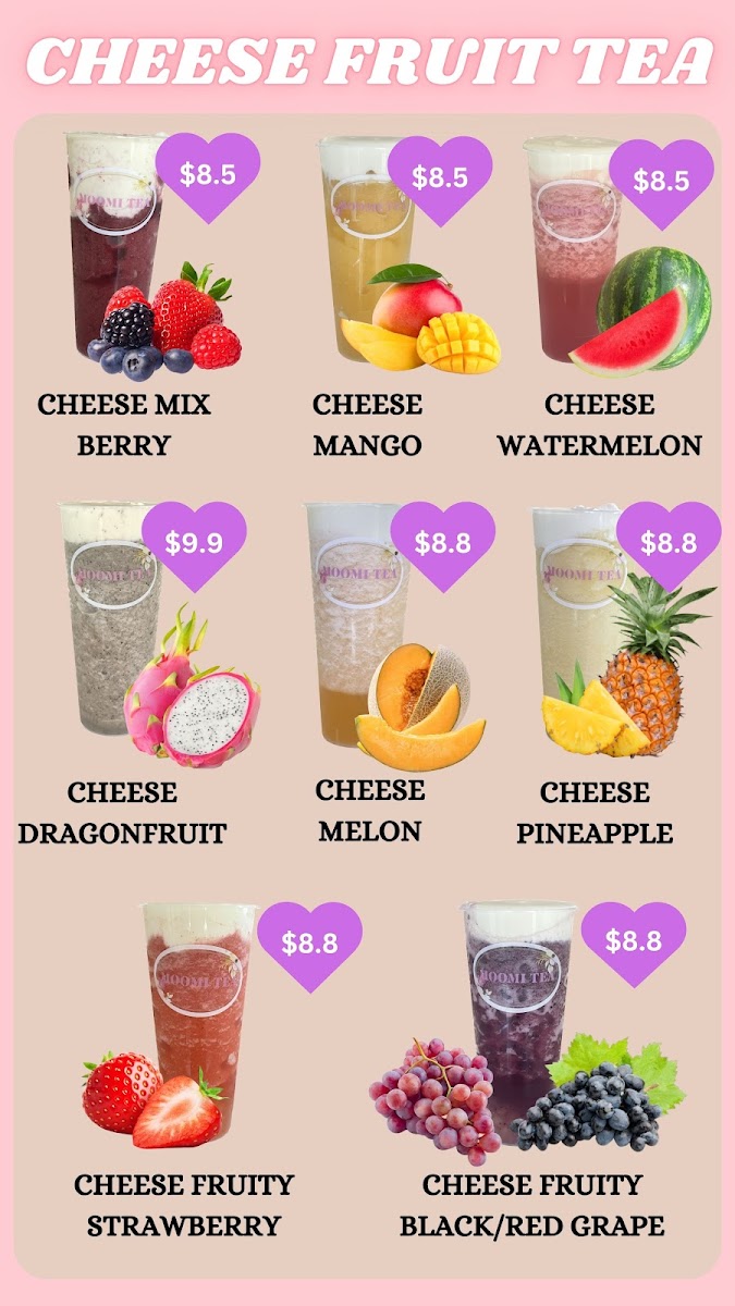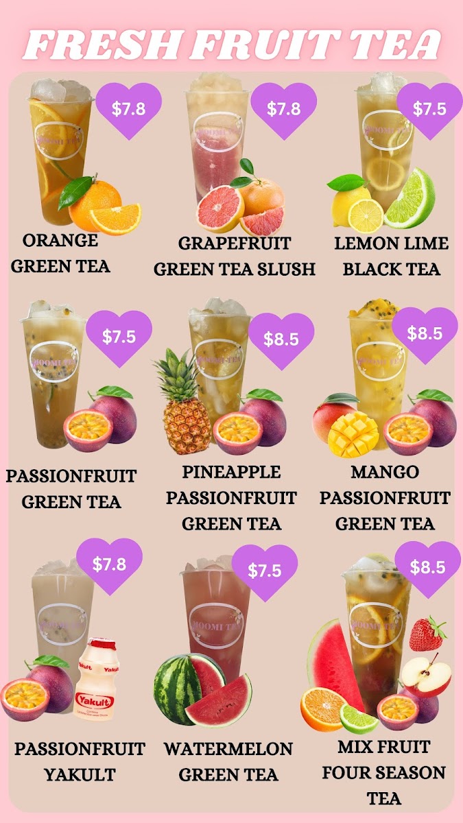 Overall, Moomi Tea’s menu at 3215 Logan Rd offers a concise yet appealing selection that balances fruity refreshment with classic milk tea indulgence. The Fresh Fruit Tea range stands out with vibrant options like Orange Green Tea and Passionfruit Green Tea, alongside more playful blends such as Pineapple Passionfruit Green Tea and the icy Grapefruit Green Tea Slush, all delivering a light, refreshing experience. For those craving something creamier, the Milk Tea lineup provides satisfying choices including Golden Pearl Milk Tea, Taro Milk Tea, and the indulgent Oreo Pearl Milk Tea, complemented by unique variations like Matcha Milk Tea and Pearl Red Bean Milk Tea. The Yakult series, featuring Orange Yakult W/Agar and Strawberry Yakult W/ Agar, adds a tangy twist with a probiotic touch, while the Cheese Fruit Tea selections-such as Cheese Mix Berry, Cheese Dragonfruit, and Cheese Mango-offer a rich, creamy foam that contrasts nicely with the fruity base. Although prices are not listed, the menu’s variety and creative combinations make it an enjoyable destination for both traditional bubble tea lovers and those looking to try something a little different.